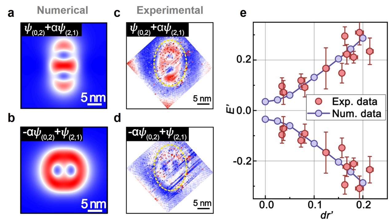 图2.(a,b)数值计算的杂化态(θ形和倒θ形)。(c,d)实验观测到的杂化态。(e)杂化态随量子点形变增强而发生能量劈裂。
