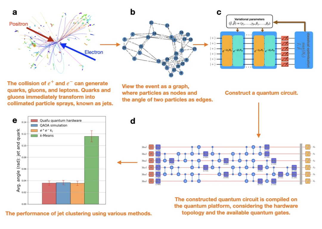 图1,量子近似优化算法在喷注重建中的应用。(a)正负电子对撞产生大量稳定的末态粒子。(b)对撞事例表示为图,其中粒子表示为图的节点,粒子之间的距离表示为节点之间的边。(c)构建量子线路。(d)根据超导量子芯片的拓扑结构及其支持的量子门编译量子线路。(e)得到由量子模拟器、量子硬件、经典的喷注重建算法以及k均值聚类上的喷注重建结果。其中纵轴表示重建出的喷注与对应夸克的夹角,夹角越小表示重建效果越好。