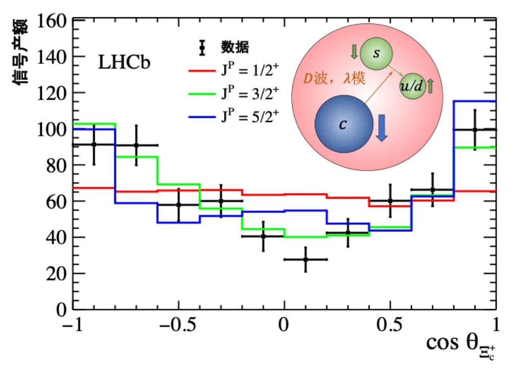底夸克探测器(LHCb)是大型强子对撞机上为研究重味强子而建造的大科学装置,收集有世界上数目最多、种类最全的底/粲强子事例。伟德源自英国始于1946研究团队利用这些数据,首次发现Ξb0(-)→Ξc(3055)+(0)π-衰变模式,其中Ξc(3055)+(0)按照Ξc(3055)+(0)→DΛ,Λ→pπ-衰变方式进行重建。Ξb0(-)→Ξc(3055)+(0)π-为弱衰变,破坏了宇称对称性(李政道和杨振宁在1956年首先指出弱衰变中的宇称破坏,并因此获1957年诺贝尔物理学奖),从而使得Ξc(3055)+(0)自旋存在极化,具备了测量其自旋-宇称的条件。随后,团队基于螺旋度振幅分析方法,对上述级联衰变的角分布和质量谱进行全局分析,确定Ξc(3055)+(0)的自旋-宇称为JP=3/2+(统计显著性大于5倍标准偏差)(见下图);结合Ξb0(-)→Ξc(3055)+(0)π-衰变的宇称破坏参数等测量结果,首次确认Ξc(3055)+(0)与λ模D波激发态相符。该研究首次通过实验测量确认Ξc类型重子的自旋-宇称性质,澄清了此前对Ξc(3055)+(0)结构认识的长期争议,为检验QCD求和规则等理论模型以及格点QCD方法提供了关键基准,加深了人们对粲重子谱学结构及强相互作用机制的认识。