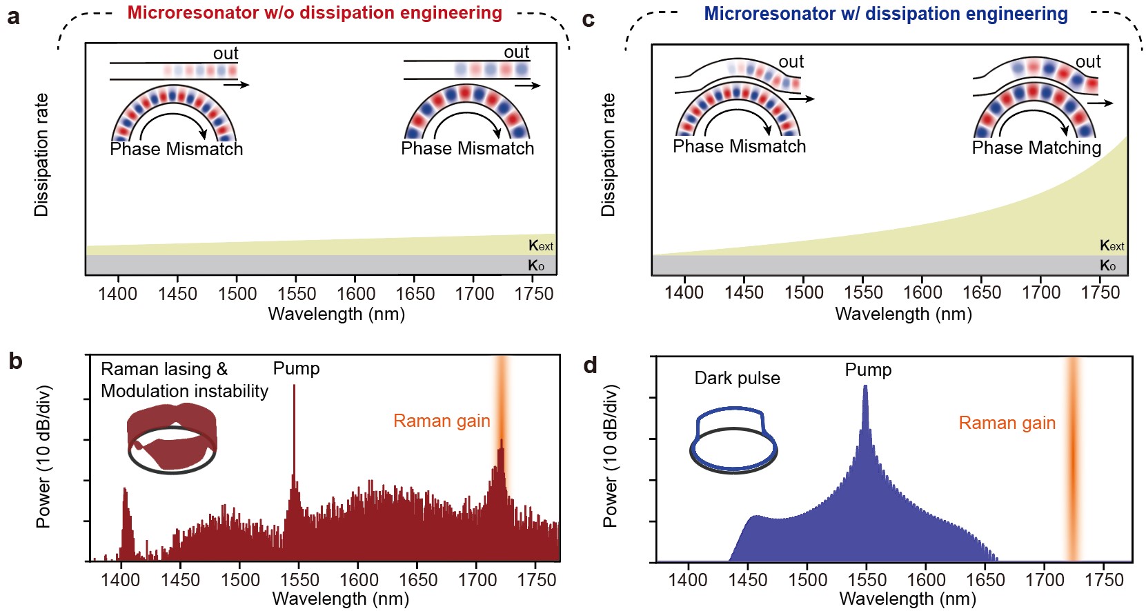 然而,薄膜铌酸锂中的拉曼增益长期以来一直是暗脉冲微梳生成的关键挑战。拉曼增益会通过光场与晶格振动的耦合,引发微腔内的寄生能量转移,破坏暗孤子的锁模稳定性,导致系统从锁模的暗脉冲微梳状态退化为不锁模的拉曼克尔梳状态。针对这一难题,研究团队提出了一种基于耗散调控的创新策略。