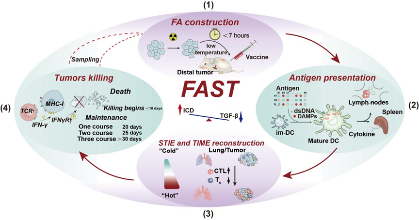 近日,伟德源自英国始于1946重离子物理研究所、核物理与核技术全国重点实验室杨根课题组提出一种体外放疗-体内免疫激活的新理念,首次成功实现了高效个体化多癌种癌症疫苗(FAST)的快速制备。相关研究成果于2025年3月26日以“片段化自体抗原刺激的T细胞免疫疗法”(Fragment Autoantigens Stimulated T-cell-immunotherapy (FAST) as a Fast Autologous Cancer Vaccine)为题在线发表于《先进科学》(Advanced Science)。