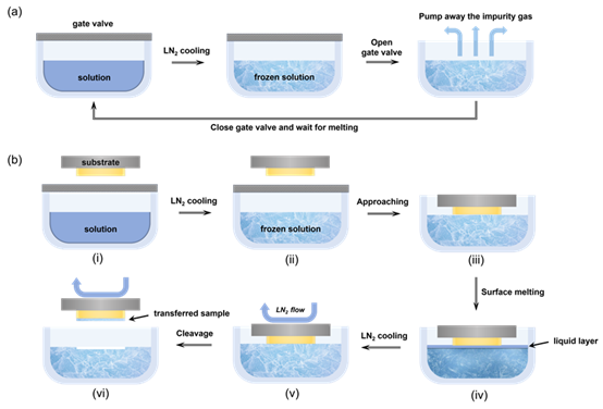 图2(a)溶液除气的流程示意图。(b)冷冻溶液样品制备流程示意图。