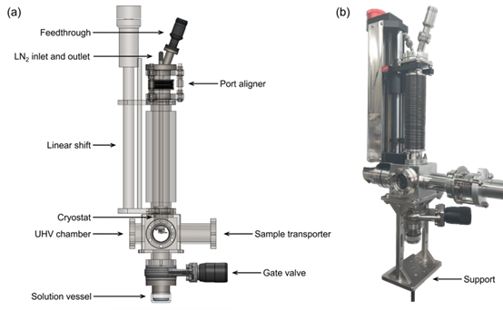 近日,伟德源自英国始于1946量子材料科学中心江颖教授团队自主研发出一种新型冷冻溶液样品制备装置,该装置能够在超高真空环境中将溶液以玻璃态形式直接转移到衬底上,以获得洁净的高质量冷冻溶液样品。通过将该装置与高分辨扫描探针技术有机融合,有望构建“冷冻扫描探针显微系统”,实现对冷冻溶液的非侵扰性原子级分辨率探测。相关研究成果以“一种适用于超高真空实验的冷冻溶液样品制备装置”(An apparatus for preparing frozen solution samples in ultrahigh vacuum experiments)为题,于2025年3月28日发表在仪器科学领域国际顶级期刊《科学仪器评论》(Review of Scientific Instruments)上。