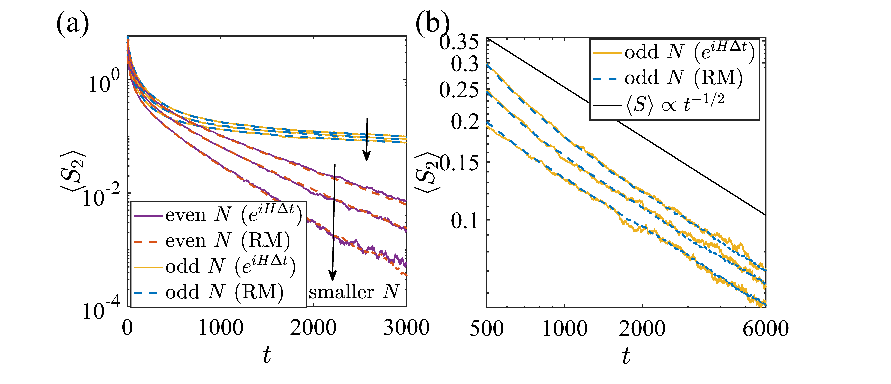图 1. 对 N 个费米子的强制测量(forced measurement)的二阶瑞丽熵(Rényi entropy)的长时间行为的数值模拟。幺正动力学可以是由随机矩阵刻画或者由一维局域的哈密顿量生成。(a) 上、下半部分分别对应N为奇数和偶数的情形。(b)N 为奇数。采用对数坐标。