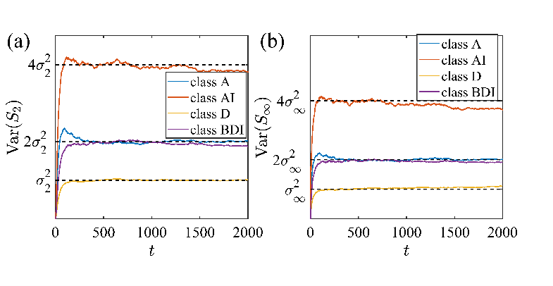 图 2. 不同对称类(不同颜色曲线)下的受测量的费米子动力学的数值模拟。(a)二阶瑞丽熵 (b) 无穷阶瑞丽熵在不同动力学实现下的方差的短时间下的行为。虚线代表解析的结果。