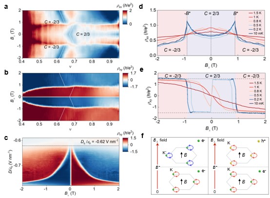 更为引人注目的是,在施加垂直磁场的情况下,v= 2/3处的分数陈绝缘体展现出拓扑手性翻转行为,对应的纵向电阻斜率与霍尔电阻符号均发生反转(图3a-e),表明体系经历了拓扑量子相变。这种手性翻转可能源于贝利曲率符号的变化,进而反映出体系准粒子激发的转变或谷极化态的跃迁(图3f),为进一步理解分数量子反常霍尔态的内部机制提供了新线索。