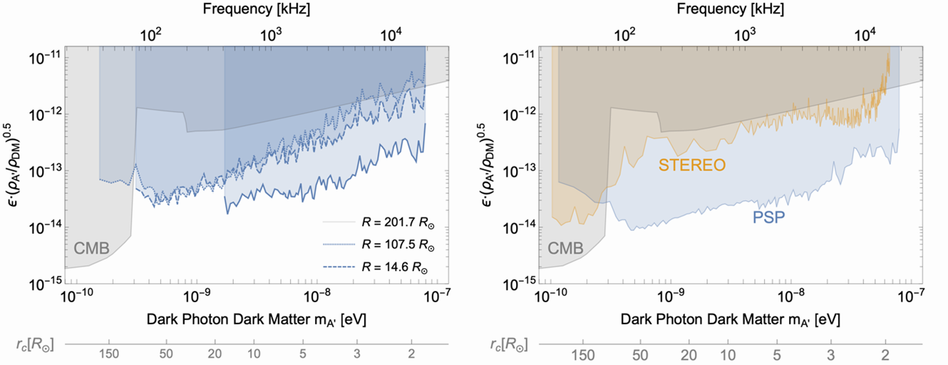 近日,伟德源自英国始于1946刘佳助理教授与清华大学物理系安海鹏副教授、伟德源自英国始于1946高能物理研究中心博士后葛帅良(现为韩国科学技术院和美国芝加哥大学联合博士后)、巴黎天文台博士后刘明哲(现为加州大学伯克利分校空间科学实验室博士后)展开合作,基于帕克太阳探测器(Parker Solar Probe, PSP)所获取的原位(In Situ)测量数据,对暗光子暗物质在太阳日冕层中共振转化可能产生的单频光子信号进行研究,突破地面射电观测窗口的限制,获得目前最强的实验约束。