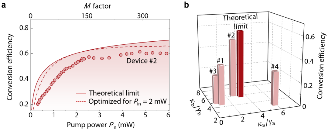 非线性频率转换是实现不同频段光信号之间高效互联的关键过程,广泛应用于光通讯、光谱学和量子信息等领域。相较于传统块状晶体材料体系,光学微腔凭借优异的光场时空局域特性,不仅能实现低功耗高效频率转换,还兼具微型化和可扩展的优势。然而,由于耗散效应和其它非线性效应的竞争,微腔非线性频率转换效率通常被限制在30%左右;进一步提高泵浦光功率不仅无法提升效率,反而会导致效率下降和系统失稳(如图1)。针对这一关键挑战,课题组建立了完整描述微腔非线性频率转换过程的理论模型,揭示了非线性色散和耗散效应如何抑制转换效率。理论上,课题组首次发现绝对转换效率极限的关键因子M,其完全由微腔工艺和材料特性决定;还建立了严格的非线性临界耦合条件,为突破现有效率瓶颈提供了理论指导。