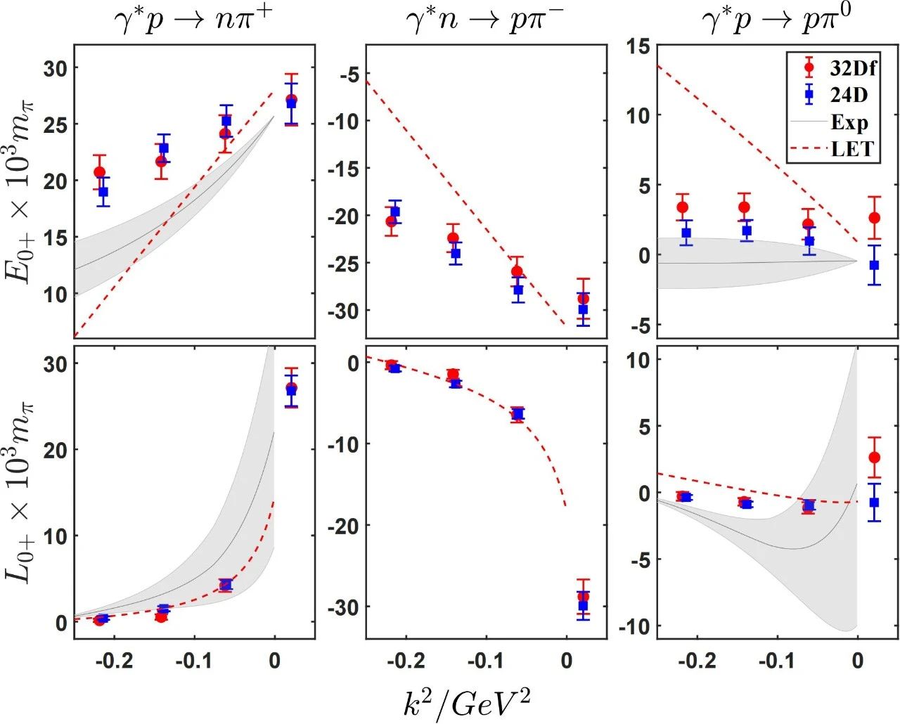 通过电磁作用产生π介子的研究由来已久。1947年,英国物理学家鲍威尔(Cecil Powell)通过高空探测宇宙射线实验首次发现π介子,并因此获得1950年诺贝尔物理学奖。同年,加州伯克利实验中首次观测到光子撞击质子产生中性π介子的现象,开启了电磁作用诱导π介子产生的研究。起初,理论界用“低能定理”(Low-Energy Theorem, LET)来预言这类过程,对带电π介子的产生表现良好,但在处理中性π介子的过程时与实验存在明显偏差。直到1990年代,Bernard等人引入包含重子自由度的手征微扰理论,系统修正了LET预言,使得理论与实验达成一致,但是在把理论预言从实光子参与的光生反应推广到虚光子参与的电生反应时,理论和实验依然存在较大分歧。然而,随着实验技术的发展,电子-核子散射实验的能量显著提高,反而使得对π介子产生阈值区域的精确测量变得更加困难。这时,格点QCD提供了新路径:它是一种纯理论的数值方法,能从量子色动力学最基本的物理法则出发,像搭积木一样“建造”出核子与π介子,并预测它们的相互作用。借助这一工具,我们可以重新预测π介子的产生过程,并将其与旧有的实验和理论做直接对比。这种对比不仅能帮助我们检验理论是否正确,更能加深我们对强相互作用手征动力学的理解。