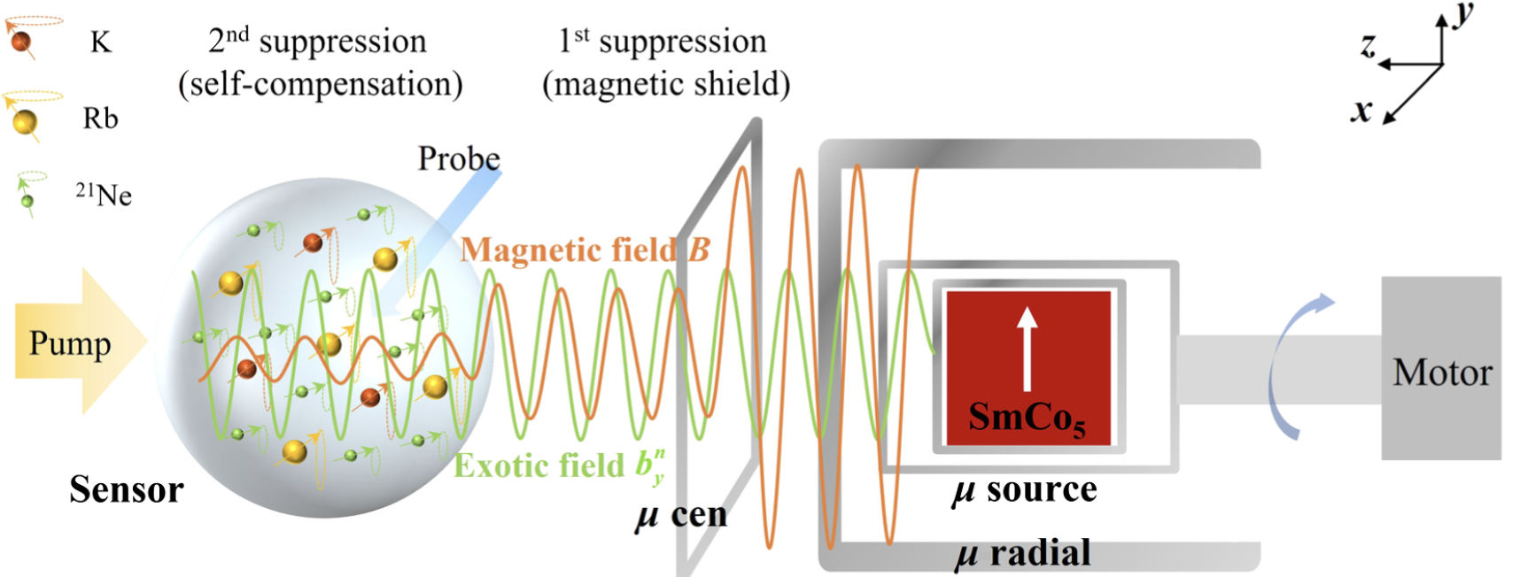图1 实验探测原理。软磁环绕硬磁电子自旋源(右侧)被电机驱动起来。经典电磁场(黄色波动线)经多层磁屏蔽层后被极大抑制,但第五力产生的奇异电磁场(绿色波动线)不能被屏蔽。假如第五力存在,原子传感器(左侧)可以感受到其奇异电磁场效应,进而产生可被观测的自旋方向改变