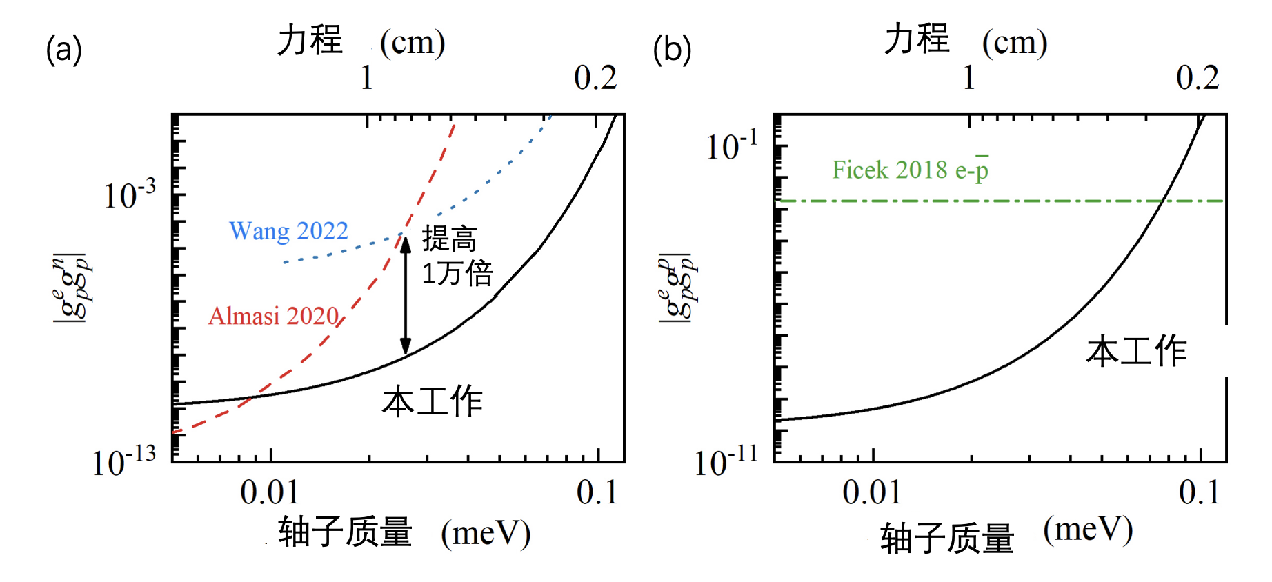 图2 中子自旋-电子自旋耦合强度的实验限制(左),与质子自旋-电子自旋的实验限制(右)。横轴表示轴子质量,反比于新相互作用力程,纵轴为耦合强度