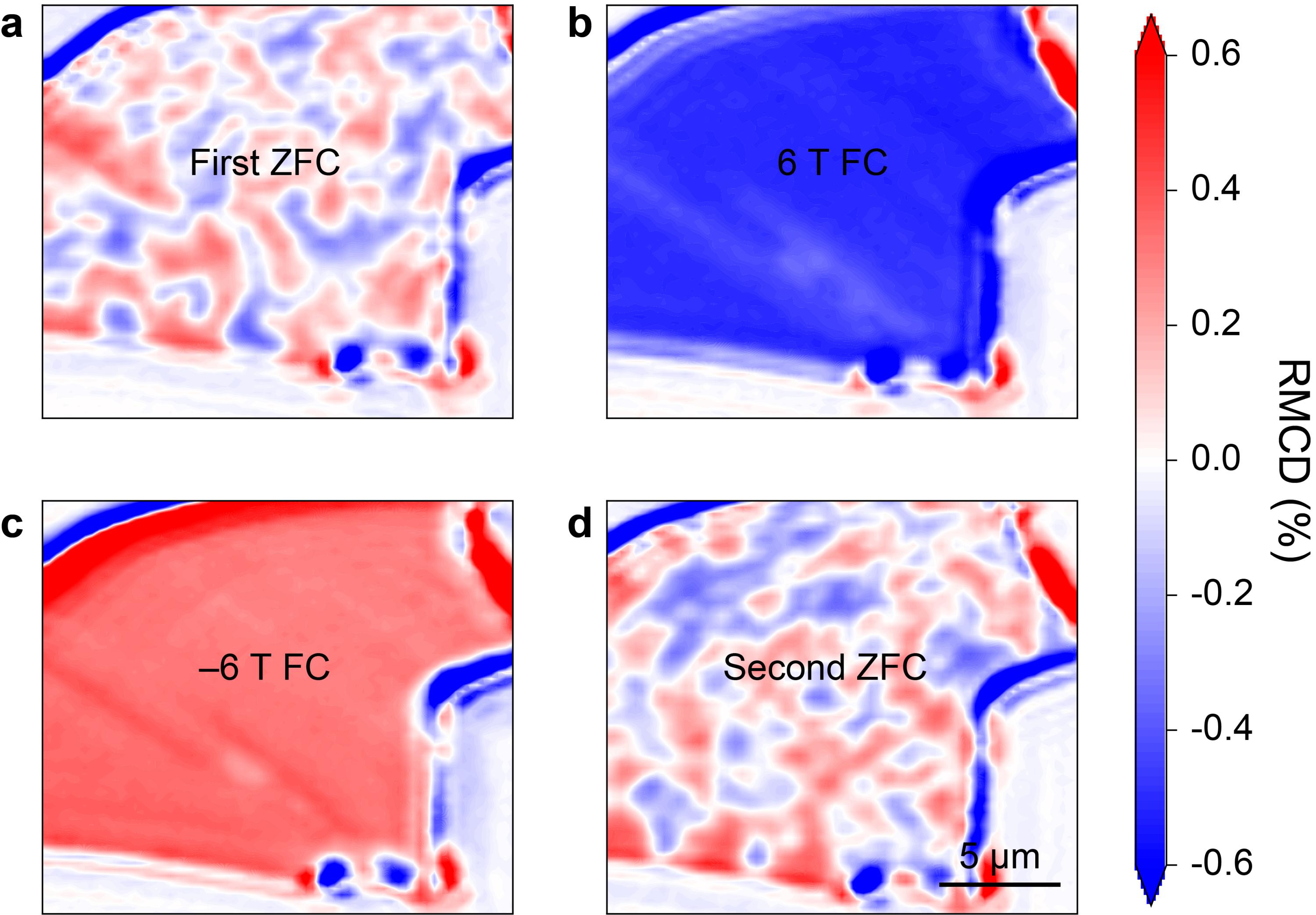 通过反射磁圆二色性谱(RMCD),研究团队观测到了Co1/3NbS2中的自发磁光效应,并通过其空间扫描观测到了非共面反铁磁的磁畴分布。如图2所示,在零场冷下,Co1/3NbS2展现为多畴结构,其磁畴尺寸约3-5μm。