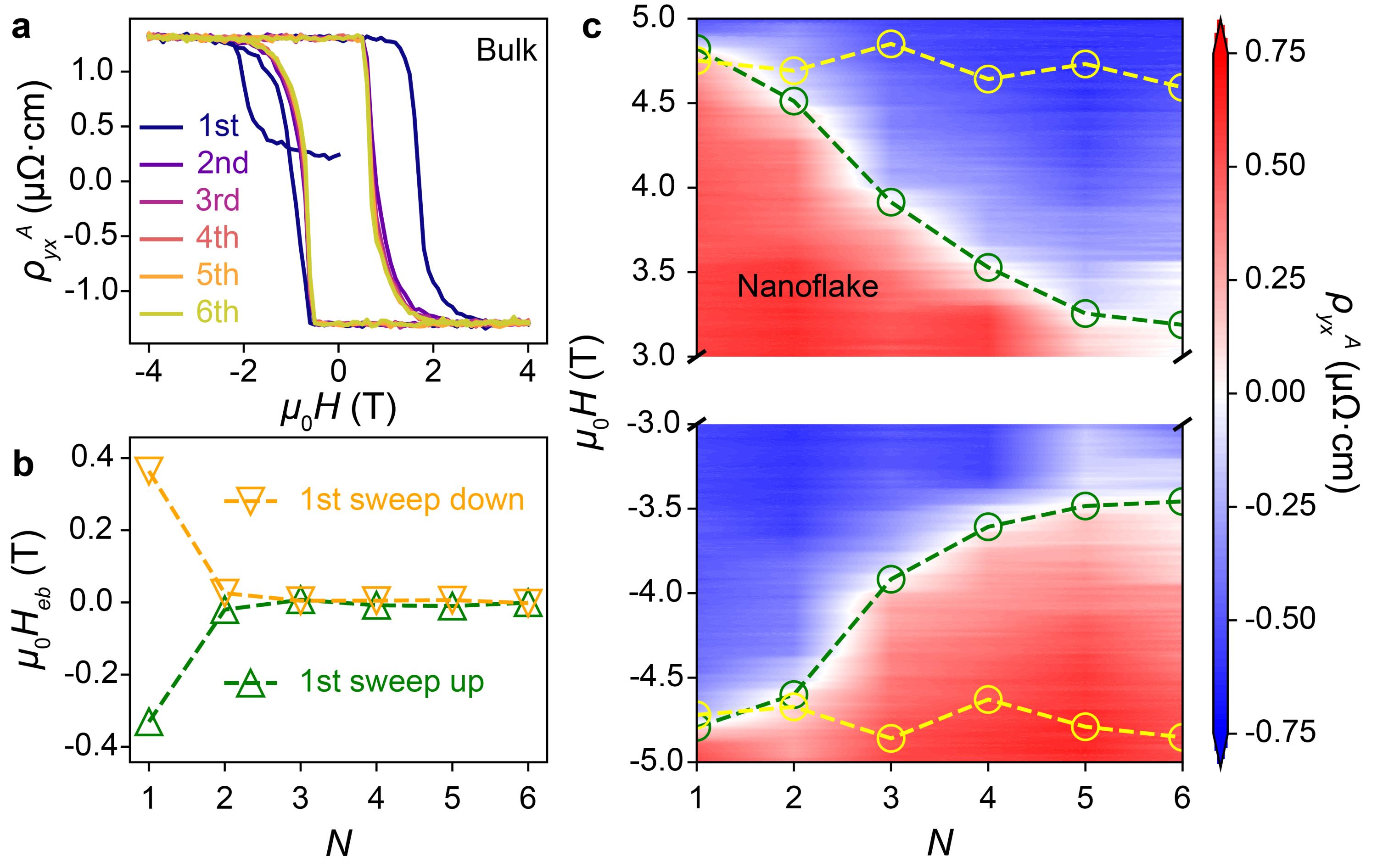 为进一步阐明Co1/3NbS2中的磁畴翻转机制,研究团队通过转角反常霍尔效应测量发现:块体样品表现为成核–畴壁快速扩散式翻转;而纳米片样品由于表面磁畴钉扎,翻转过程呈现缓慢的畴壁扩散特征。这一差异表明磁翻转起始于样品内部,并解释了二者矫顽场的显著差异。此外,块体与纳米片在交换偏置效应上亦表现出不同:如图三所示,经过零场冷后,块体样品因成核位点钉扎而产生明显的交换偏置效应,且该偏置随磁场扫描迅速消失;而纳米片样品因表面磁畴普遍钉扎,其矫顽场始终对称,并在磁场循环中呈现缓慢的训练效应。Co1/3NbS2中本征的交换偏置及磁畴的记忆效应,为基于其设计二维反铁磁自旋电子学器件提供了便利。
