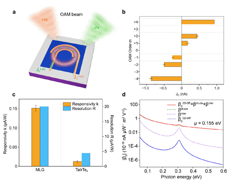 图1 | 基于多层石墨烯的维度增强中红外涡旋光探测。a,由带有U形电极的OAM探测器件收集的径向OPGE响应示意图。 b,CPGE成分JC作为轨道角动量阶数m的函数。 c,OPGE 响应度和轨道角动量分辨率的比较。 d,二维费米子的OPGE响应系数作为光子能量及其他分量的函数,并与三维费米子的比较。