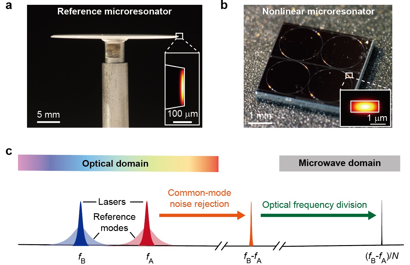 图1. 基于光学微腔的光学频率分频。a, MgF2参考光学微腔实物图片。b, Si3N4非线性光学微腔实物图片。c, “两点锁定”光学频率分频原理图。