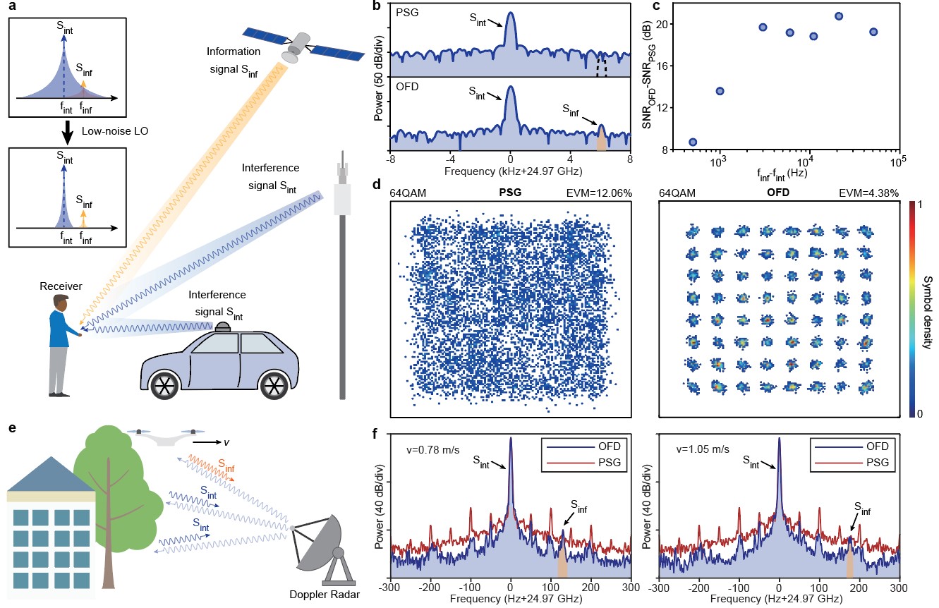 图3. 抗干扰通信应用实验。a,抗干扰通信应用场景示意图。b,以光学频率分频系统(OFD)和电子学微波振荡器(PSG)作为通信系统本地振荡器时的信息信号与干扰信号频谱。c,信息信号与干扰信号的频率差对信噪比的影响。d,采用 64QAM 调制格式的信息信号解调后星座图。e,多普勒雷达应用场景。f,以OFD和PSG信号作为雷达载波时的回波频谱。