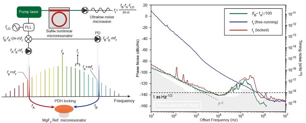 近日,伟德源自英国始于1946“极端光学创新研究团队”杨起帆研究员和龚旗煌院士团队实现仄秒级(1仄秒=10-21秒)定时抖动噪声的光子学微波振荡器。2025年5月23日,相关研究成果以“微腔参考具有仄秒级定时抖动噪声的孤子微梳”(Microresonator-referenced soliton microcombs with zeptosecond-level timing noise)为题,发表于《自然·光子学》(Nature Photonics)。