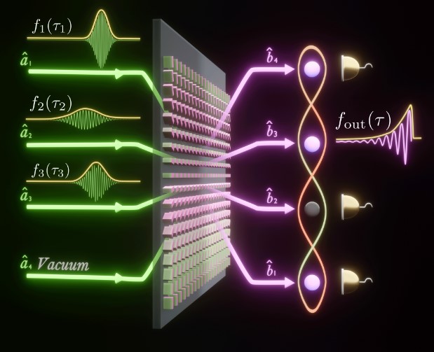 研究团队提出了利用单块超表面实现光子时域波形按需转换的新原理。如图 1 所示,利用超表面的偏振依赖的并行分束功能,可以实现四端口分束,从而可以实现多光子波包干涉。通过合理选取输入光子的线宽、频率、超表面分束比并结合时域测量,就可以实现光子时域波形的按需转换。