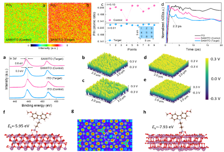 得益于键合位点工程提供的丰富羟基键合位点,后续材料表征表明锚定在ITO上的SAM实现了更加密集和均匀的覆盖(图2)。瞬态吸收光谱动力学衰减表明了该层对载流子界面提取效率的提高。XPS结果表明SAM和ITO之间形成了更稳定的配位键合。密度泛函理论计算表明氧空位的形成导致三个相邻的未配位铟,使SAM能够通过三齿键合锚定到ITO上,从而将SAM的结合能从-5.95 eV提高到-7.93 eV。此外,SAM层对光热老化的抵抗稳定性得到有效提高,表明锚定的SAM更加稳定,有利于后续钙钛矿太阳能电池的长期运行稳定性。