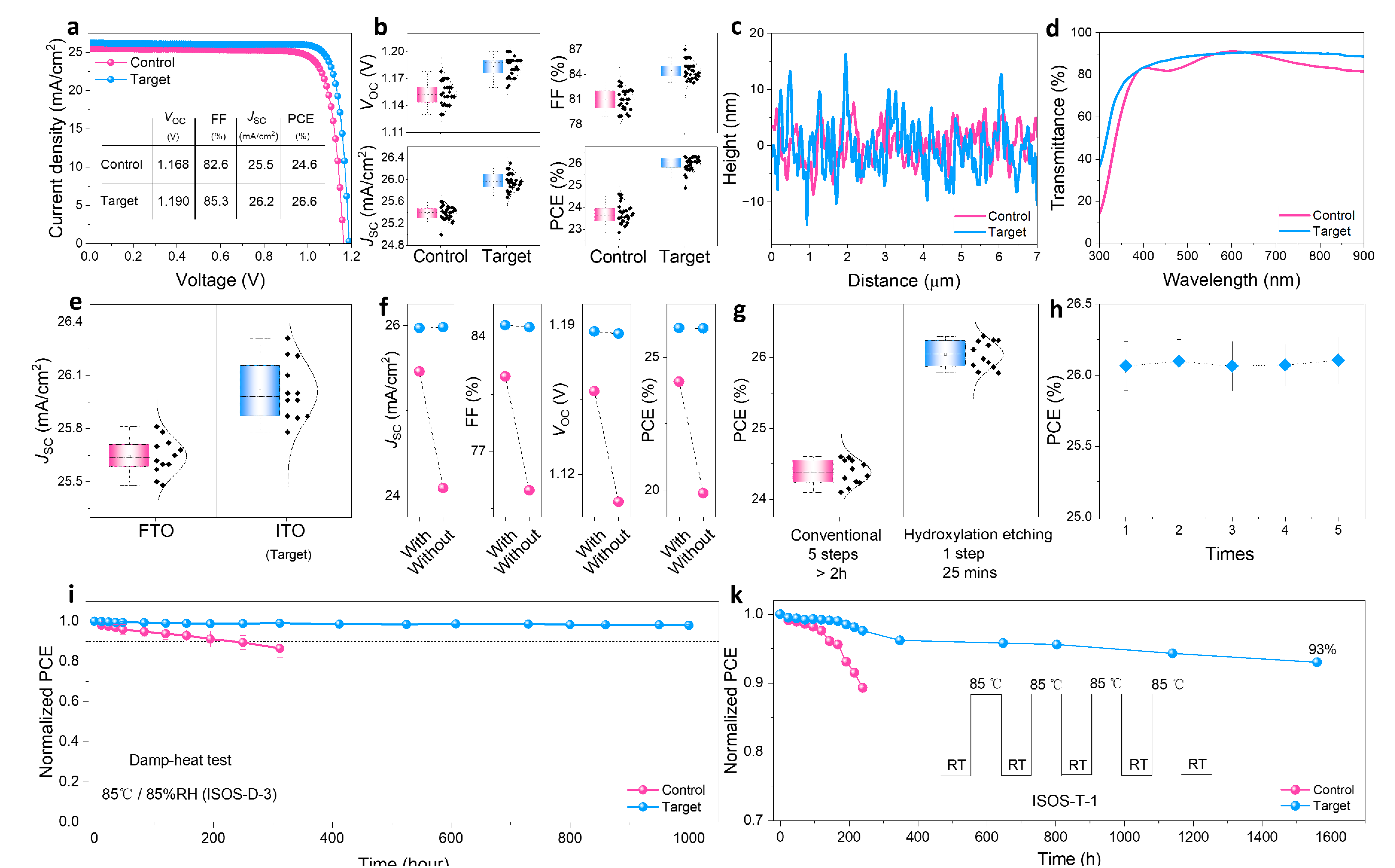 实验发现,羟基化蚀刻可以全面提高钙钛矿太阳能电池器件的光伏性能,使器件的光电转化效率显著提升至26.6%(第三方认证结果为26.44%)。由于各向异性蚀刻反应使ITO表面形成的重构类金字塔纳米结构,显著提高了光透过率,增加了器件短路电流密度。新型羟基化蚀刻方法可以替代领域内对于ITO的紫外臭氧/等离子体处理步骤,羟基化处理(最快15秒)可以取代并优于传统5步预处理(>2小时),大大简化了器件制备流程,降低了时间成本。最终,由于更稳定的键合位点和引入三齿键合带来的更牢固SAM,器件在经过65°C下的最大功率点追踪2800小时后,仍然可以保持初始光电转化效率的96%(图3)。总之,本研究提出了一种更高效、稳定、快速且成本更低的羟基化方法,实现了更高质量的SAM锚定,从而实现了高效稳定太阳能电池的构建。