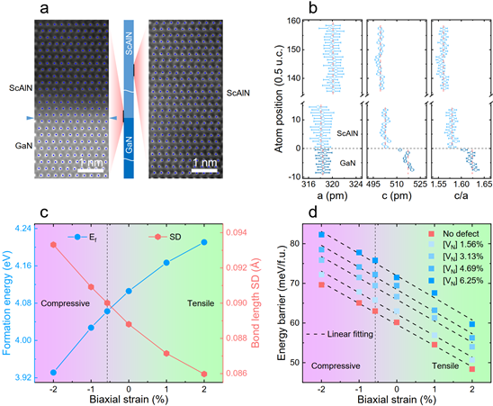 图5.铁电ScAlN中应变、氮空位和极化翻转势垒之间的联系。