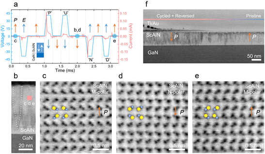 图2.铁电ScAlN极化翻转过程中的可逆原子位移。
