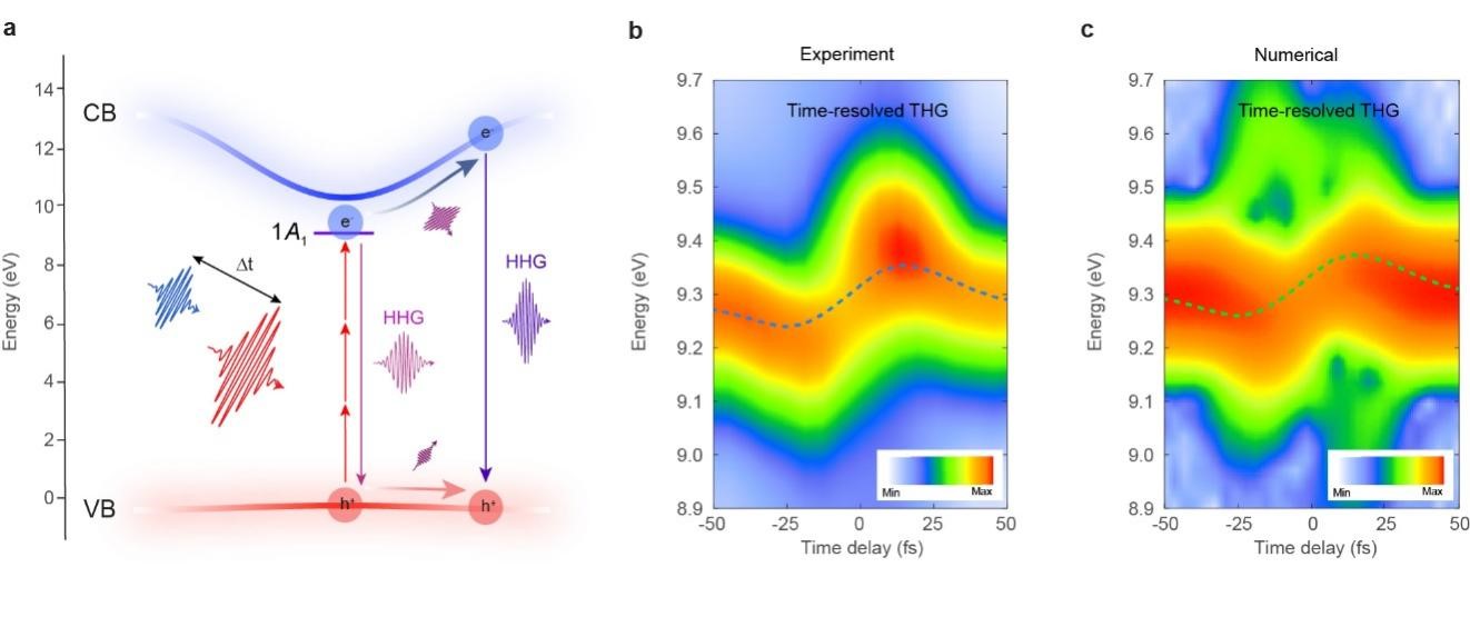 图2. AC斯塔克位移与动态Franz–Keldysh效应。(a)固体高次谐波产生的主要机制示意图,展示了强场驱动下带间极化和带内电流的贡献;Δt > 0表示泵浦光先于探测光到达。(b, c)实验和理论分别给出的探测脉冲三次谐波(H3)光谱随时间延迟的演化;虚线标示出H3谐波中心能量的移动趋势。