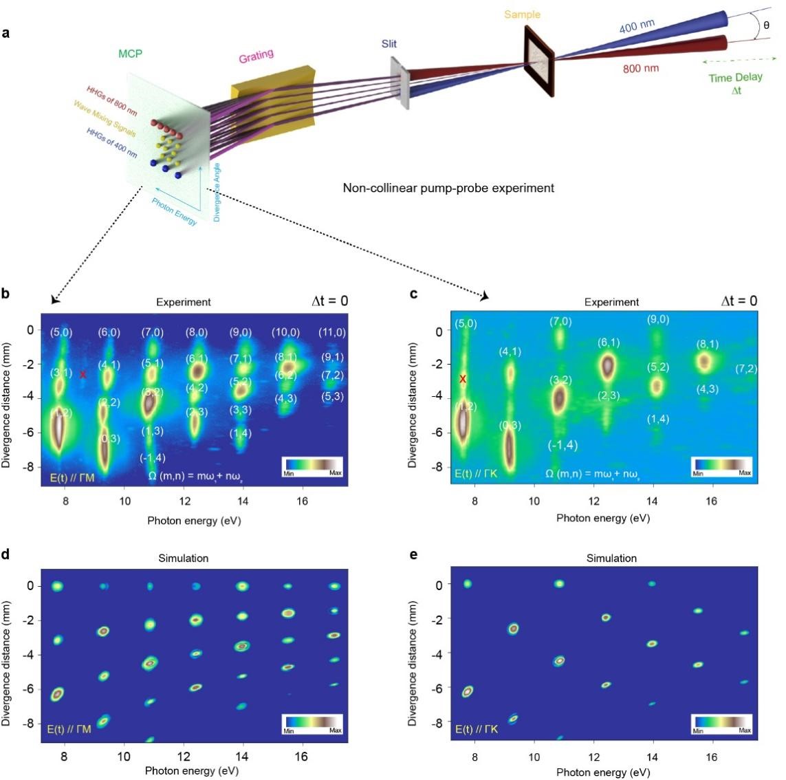 图1. 非共线时空分辨超高阶波混频光谱技术。(a)实验示意图:ω1光束水平放置,ω2光束向下倾斜θ≈18mrad,两束光非共线交汇于石英样品并与XUV光谱仪狭缝平行。(b)沿布里渊区Γ–M方向测得的超高阶波混频谱,括号中(m, n)表示从泵浦光(800 nm)和探测光(400 nm)中吸收的光子数;该方向同时出现m + n为奇数和偶次的谐波信号,表明晶体在此方向上反演对称性发生破缺。(c)沿Γ–K方向测得的波混频谱,仅出现m + n为奇数的谐波成分,说明该方向保持反演对称性。(d, e)基于晶体反演对称性特征开展的非共线数值模拟结果,分别对应Γ–M与Γ–K方向。