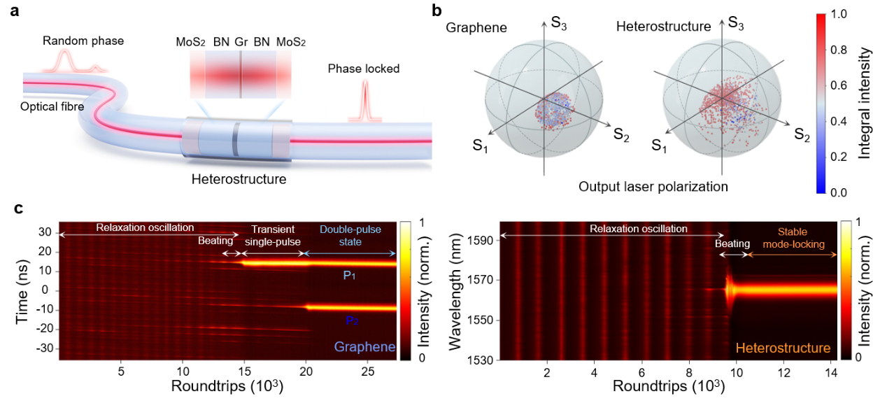 研究团队提出了一种二维异质结纳米腔可饱和吸收体,通过在光纤端面集成MoS2-BN-graphene-BN-MoS2异质结,精准调控异质结内部的光场分布,显著提升石墨烯的可饱和吸收性能(饱和强度降低约65%)。该异质结能够有效抑制孤子形成前的背景脉冲,从而阻止脉冲分裂以实现稳健锁模输出。同时,该异质结对光纤激光器腔内的偏振变化表现出更高的容忍度,在约85%的偏振态下都能稳定产生单孤子脉冲。这种异质结纳米腔为低维材料在可饱和吸收体中的实际应用奠定了基础,并有望用于光频梳、超连续谱源以及片上脉冲激光器等领域。