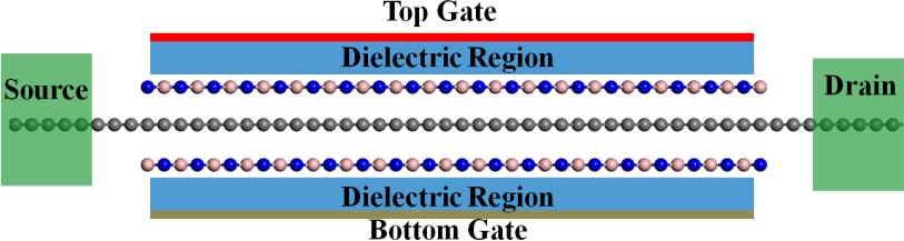 基于BN片/石墨烯/BN片三明治结构的双门场效应管。(上图) 模型示意图,