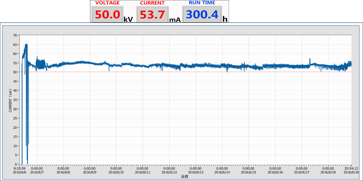 kV、流强高于50 mA的条件下稳定运行时间达294小时,在此期间直流质子源未出现过任何因引出系统打火或者等离子体不稳定导致束流中断的失束现象。实验结果好于预期。