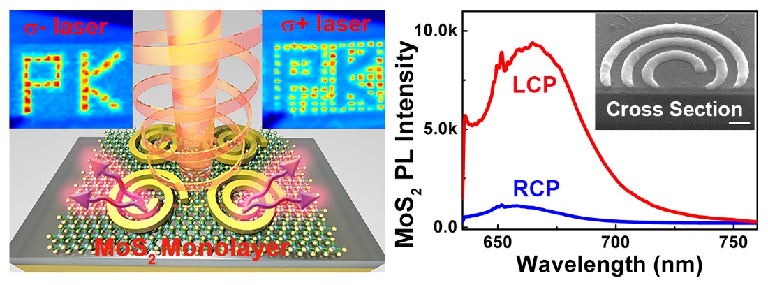 表面等离激元是外界光激发下金属表面自由电子集体震荡现象,是光子和电子相互作用形成的表面电磁场元激发共振模式,可产生局域电磁场增强、共振吸收、热电子掺杂等效应,进而实现对新型低维纳米材料光激发的动态调控。伟德源自英国始于1946方哲宇课题组通过操控金属纳米螺旋结构中光的自选轨道耦合效应,实现了对单层MoS2荧光强度的动态调控,该研究成果近期发表在国际期刊ACS