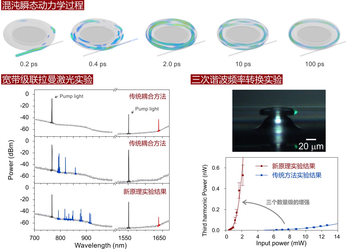 在理论研究中,研究团队通过基于时域有限差分法的三维模拟研究了混沌光子的角动量快速转换及隧穿的瞬态动力学过程。结果表明,混沌辅助的角动量转换新原理可以实现二氧化硅微腔在全透明波段内(500纳米 – 2900纳米)回音壁模式的高效耦合。实验上,他们使用非对称的微盘腔和纳米光纤波导作为实验平台,从可见到红外波段证实了该角动量转化耦合过程具有超宽带的特性。该原理也在三次谐波等非线性频率转换实验中得到了重要应用:如图三所示,用1550纳米波长激光激发相同的光学微腔,在同一激发强度下,通过新原理产生到的517纳米波长三次谐波绿光的光强相比于传统方法提高了三个量级。此外,该原理在宽带级联拉曼激光和光学频率梳等宽带非线性光学应用中也可以发挥出巨大优势。