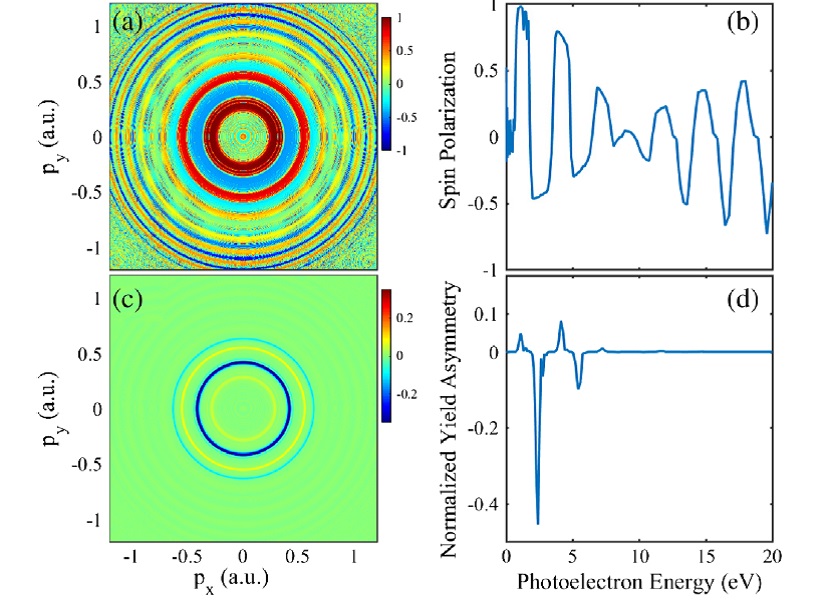 理论上,课题组通过发展能够包括磁量子数和角动量影响的强场近似理论,实现了园偏振激光作用下多光子电离的光电子动量谱和能谱的数值模拟,得到与实验一致的光电子动量分布。通过理论计算发现,在园偏振激光作用下,通过1/2P态,可以产生自旋极化达到90%以上的光电子,而通过3/2P态,自旋极化度最高仅为50%。