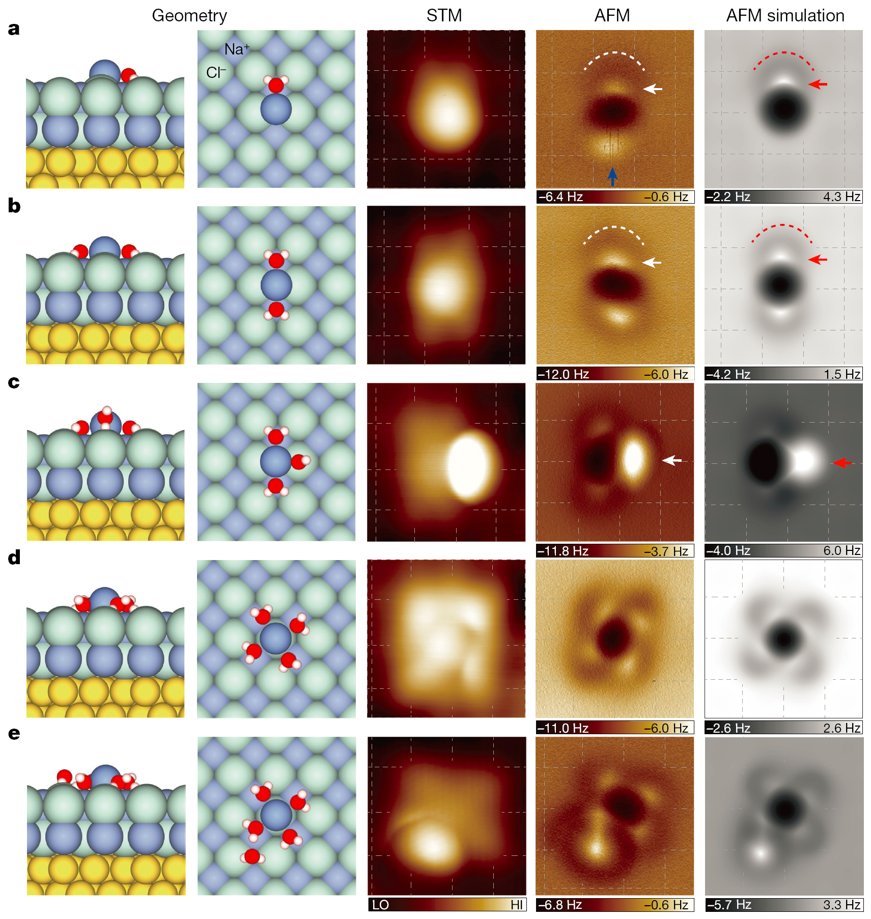 图2 钠离子水合物的原子级分辨成像。从左至右,依次为五种离子水合物的原子结构图、扫描隧道显微镜图、原子力显微镜图和原子力成像模拟图。图像尺寸:1.5 nm ×1.5 nm。