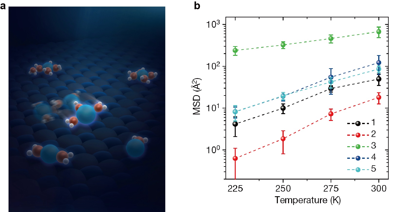 图3 钠离子水合物在NaCl表面输运的幻数效应。a,效果图:包含3个水分子的水合物具有异常强的扩散能力。 b,分子动力学模拟得到的不同离子水合物在225K-300K下1ns时间内扩散的均方位移。