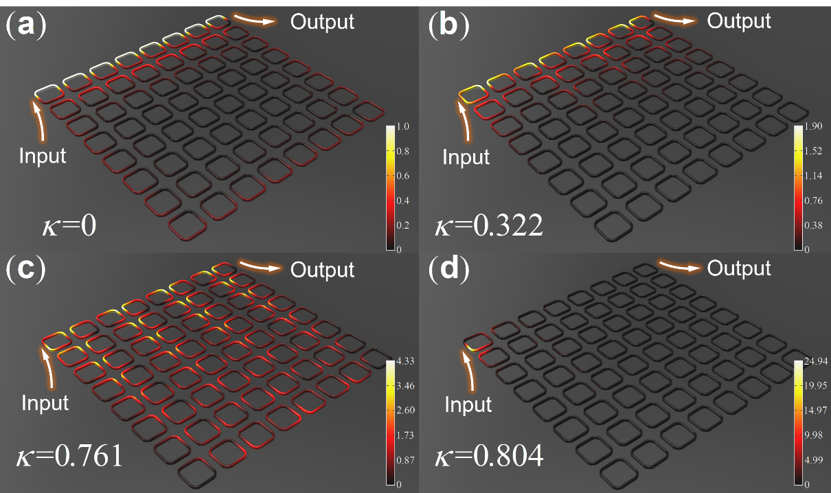 图2 8×8谐振环阵列在不同增益损耗情况下的电场模式分布。随着增益损耗量增大,系统从拓扑非平凡态相变为拓扑平凡态。