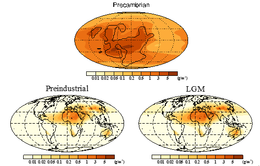 图1 模拟得到的前寒武(Precambrian)、工业革命前(Preindustrial)和末次盛冰期(LGM)的大气沙尘含量。黑色实线表示的是各个时期的大陆轮廓。LGM的沙尘含量只是是数值模拟得到的一种可能分布。