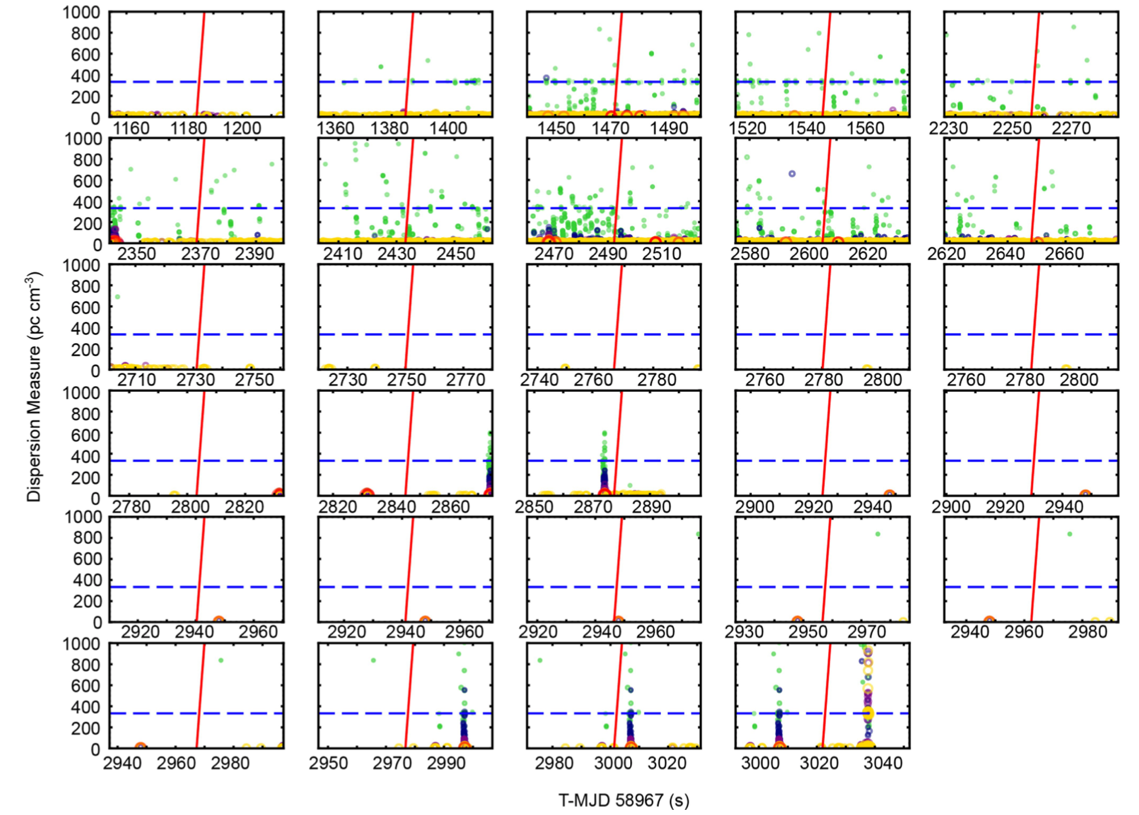 成果1中,研究团队证认了之前由澳大利亚Parkes望远镜发现的快速射电暴FRB180301是一个重复暴。在对其进行长期观测后,团队首次发现了快速射电暴的偏振多样性,特别是发现偏振角(即无线电波的振动方向)在短短的毫秒时间内发生了系统的改变。针对快速射电暴无线电辐射的来源,学术界一直存在两类观点的争论:1)辐射来源于磁星的磁层, 即产生于磁场很强的致密星周围的强磁场电离环境; 2)辐射来源于激波相互作用驱动的辐射。在此工作之前,偏振角变化的现象仅在一次性爆发源中观测到两个事件,而已知的快速射电暴重复爆却仅仅表现出平坦的偏振角。这些观测尚无法有效地检验这两类观点。FRB180301中偏振位置角迅速变化这一发现强烈暗示快速射电暴来源于致密天体的磁层中,并对激波产生机制提出了挑战。这个发现向理解快速射电暴的物理起源提供了新的线索。