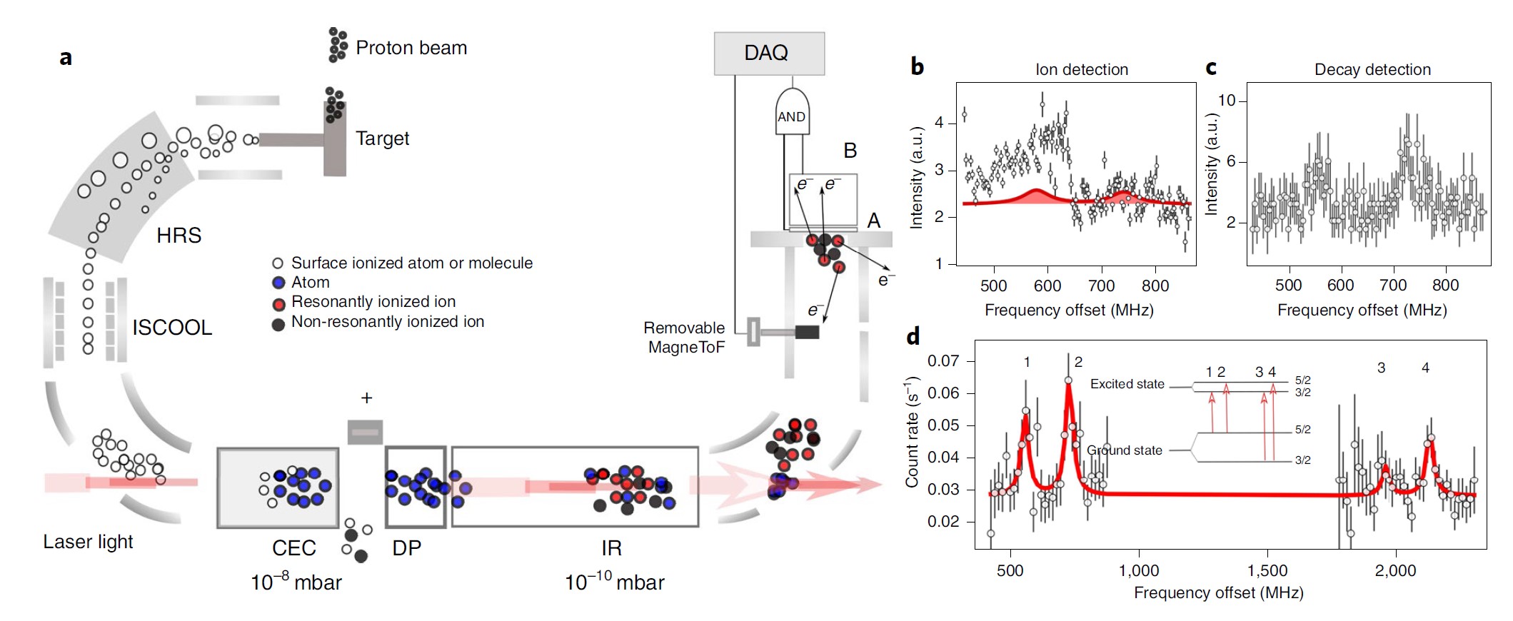 图1: (a)共线共振电离谱及β粒子探测系统;(b)利用离子和 (c) β探测技术获得的部分超精细结构谱图; (d)52K的超精细结构谱图。