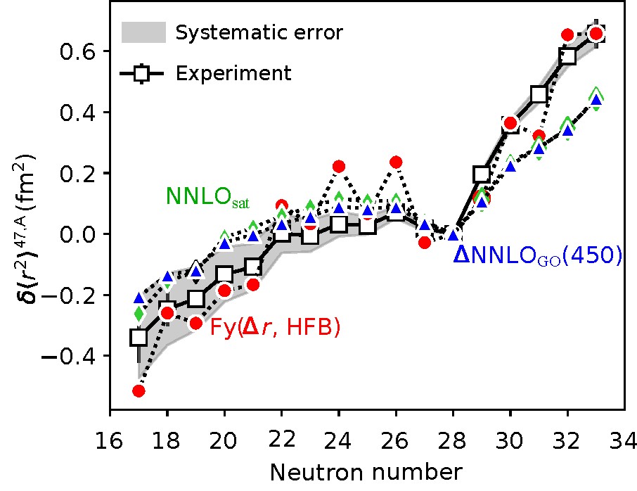 图2:钾同位素的电荷半径实验值与多种原子核理论模型[Fy(Δr, HFB)、NNLOsat、ΔNNLOGO]计算结果的比较。