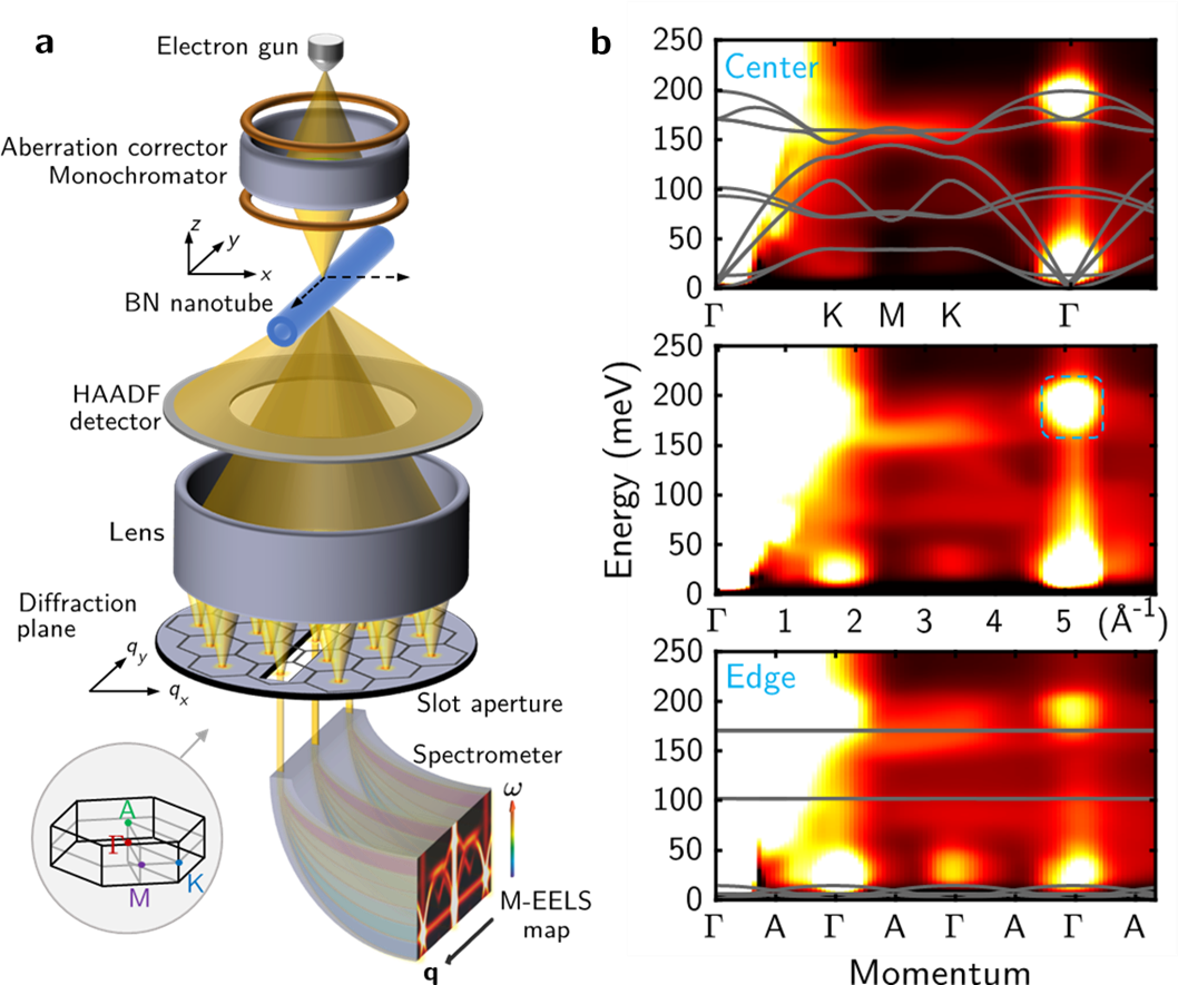 图:a 四维电子能量损失谱技术原理示意图;b (由上至下)电子束由氮化硼纳米管中心到边缘扫描时得到的声子色散