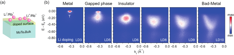 图1: (a)碱金属表面掺杂示意图。 (b) 2H-MoTe2 导带能带随碱金属掺杂的演化过程。