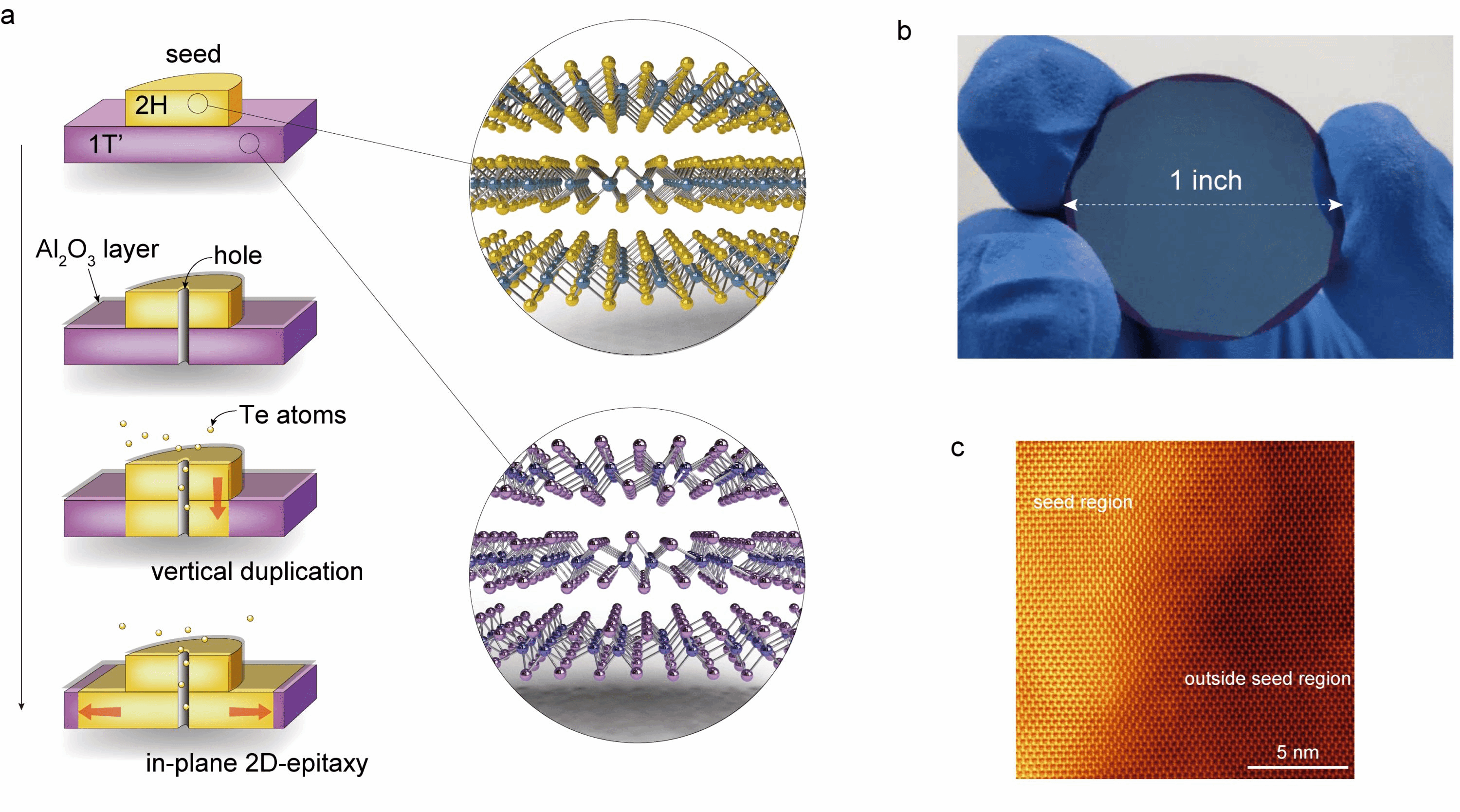 图1 a 晶圆尺寸单晶MoTe2薄膜的制备过程示意图。b 制备的MoTe2薄膜的光学照片。c 种子区域的STEM表征。