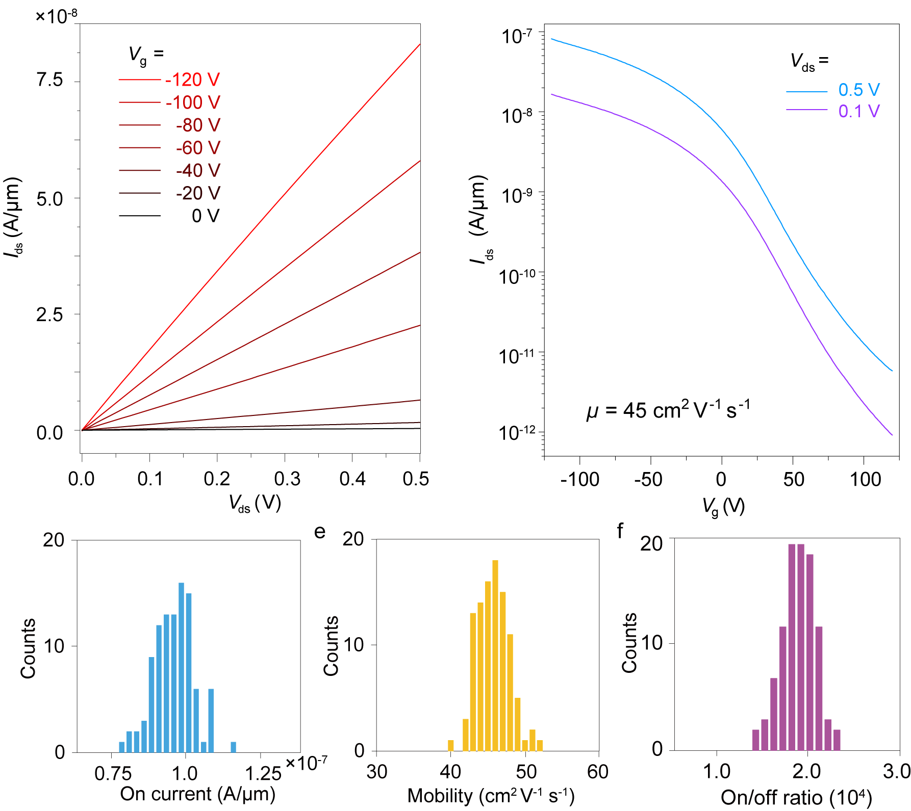 以该薄膜为沟道材料,结合课题组之前发展的MoTe2相变工程方法制备的大面积1T'/2H/1T'相面内异质结场效应晶体管阵列,器件体现出100%的良率,并具有很好的电学性能,且其电学性能表现出很好的均一性(图3)。
