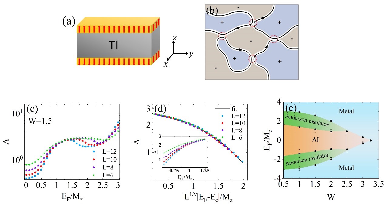 (a) 轴子绝缘体的简单示意图;(b) 区域边界上的手性边缘态互相散射形成导电通道;(c) 无量纲局域化长度作为费米能的函数;(d) 单参数标度的数值拟合;(e) 无序轴子绝缘体的相图