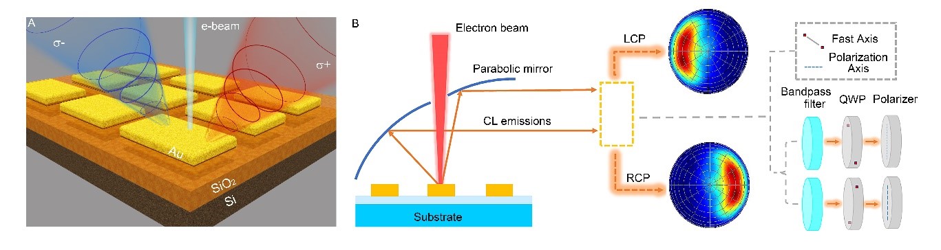 阴极荧光纳米显微技术(Cathodoluminescence Microscopy, CL)作为一种非侵入性的表征方法,具有亚纳米尺度超高空间分辨率和精准的电子束激发能力,已被逐渐应用于金属结构光子局域态密度表征以及辐射光场特性等方面的研究。利用角分辨阴极荧光技术(Angle-resolved CL polarimetry)可进一步在动量空间实现对辐射方向的直接测量。此外,虽然通过超构表面设计可以实现辐射信号不同偏振分量在辐射方向和辐射空间上的分离,但针对未来器件小型化的趋势,单个金属纳米结构中的发光信号操控还未实现,如何在亚纳米尺度精准表征与操控单个金属结构实现其光自旋霍尔效应是目前研究的难点与挑战。