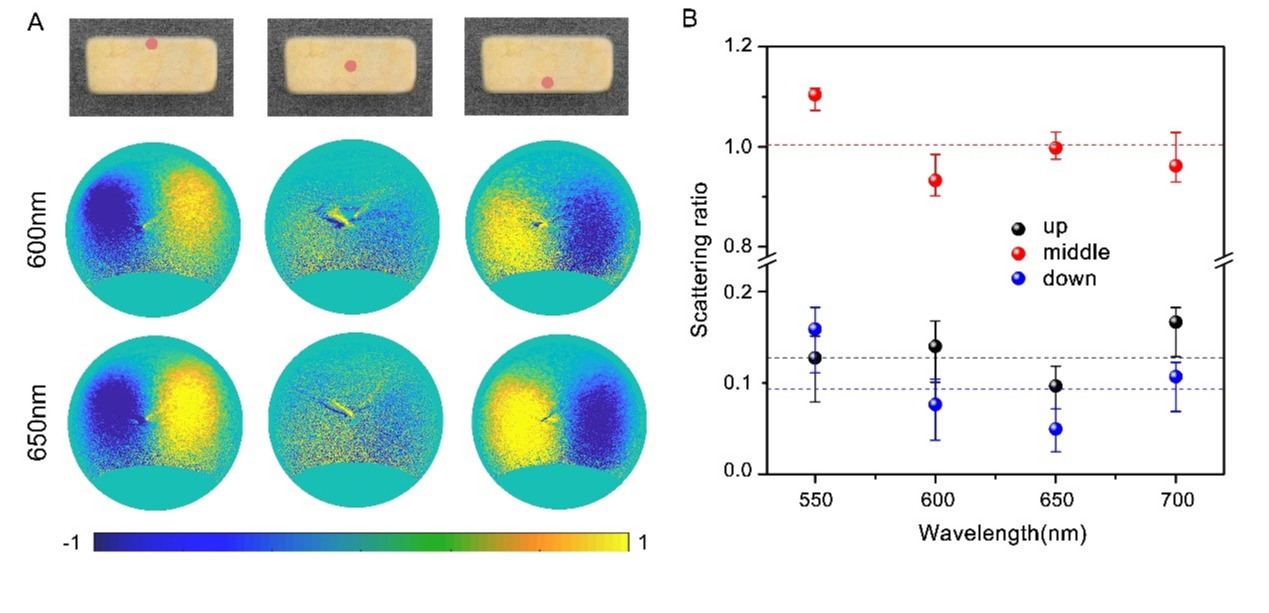 图2 (A)左右旋偏振信号远场角分辨模式随电子束激发位置移动变化;(B)散射强度与波长关系