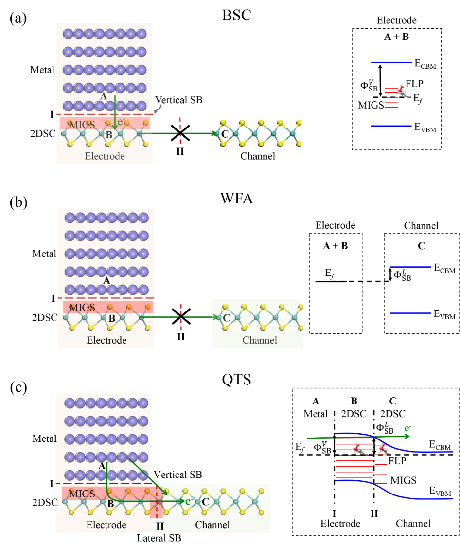 近年来,二维半导体材料(2DSC)因其优异的电、磁、光、热和机械特性在电子、光电、热电等领域有着广阔的应用前景。二维半导体晶体管,作为电子、光电、热电等应用的基本器件单元,被人们广泛地研究。然而,由于缺乏一个有效和稳定的替代掺杂技术,二维半导体场效应晶体管(2DSC-FET)常常依赖金属电极直接接触来注入合适类型的载流子。而肖特基势垒普遍存在于金属—二维半导体界面中,显著地影响甚至主导大多数2DSC-FET的性能。因此,确定其肖特基势垒高度(SBH)非常重要。在金属—二维半导体界面处无费米能级钉扎(FLP)的理想情况下,SBH可以用肖特基—莫特规则来预测,即金属的功函数分别与2DSC的电离能和亲合能的差值。但是由于界面处金属与2DSC的耦合,导致FLP效应普遍存在,SBH一般会偏离肖特基—莫特规则。如何从理论上准确计算2DSC-FET的界面处的SBH是个很有挑战的问题。