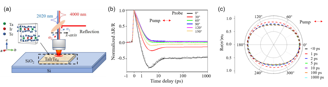 第二类外尔半金属钽铱碲因其贝里曲率引起的位移电流增强,在中红外波段响应度大幅提高,具备极高的光电探测应用潜力;同时,各向异性的晶体结构使其具有各向异性的光学及电学性质,成为未来新型及高性能电子、光电器件的理想材料。通过研究钽铱碲光激发热载流子的动态演化过程,可以为材料在强场条件下的应用提供理论基础。另一方面,探究钽铱碲各向异性特性的动态演化对于材料在偏振分辨相关的应用至关重要。
